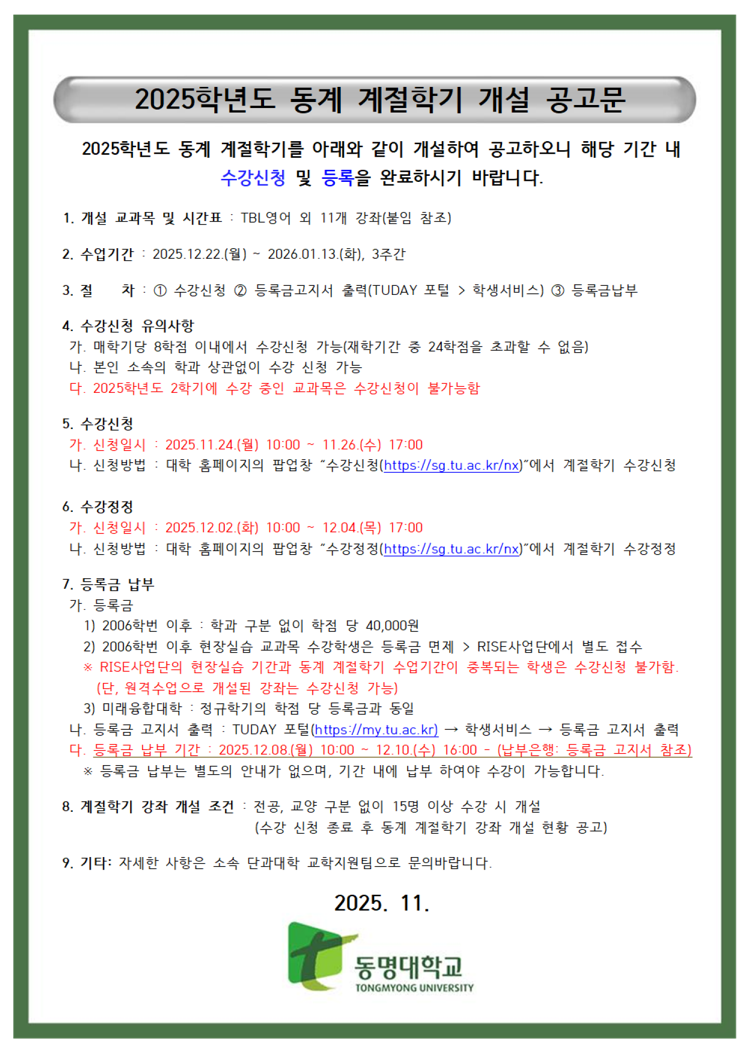 [국제교류팀] 2025학년도 동계 TU 글로벌 어학연수 프로그램 참가자 모집 안내