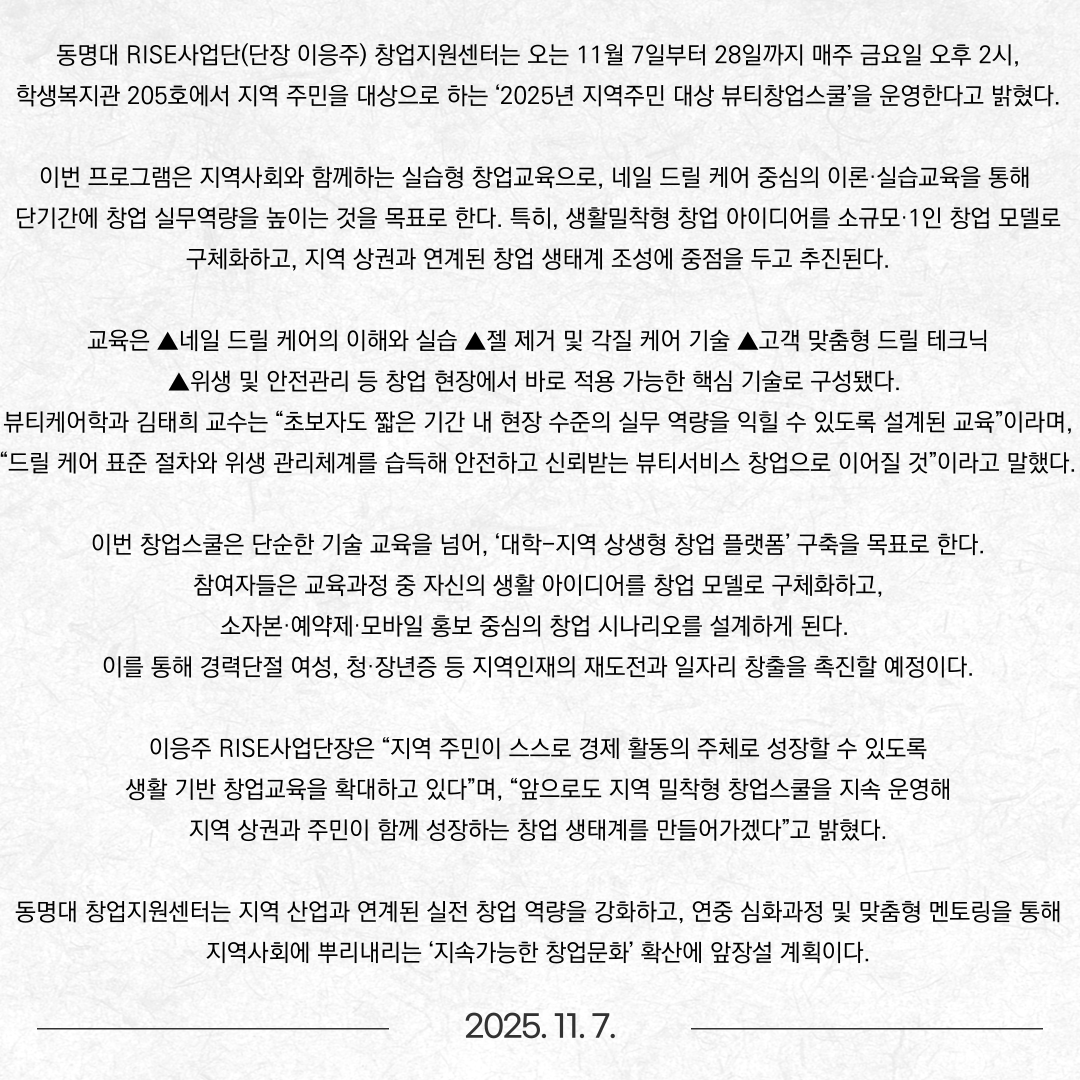 동명대, 지역주민 대상 뷰티 창업스쿨 운영