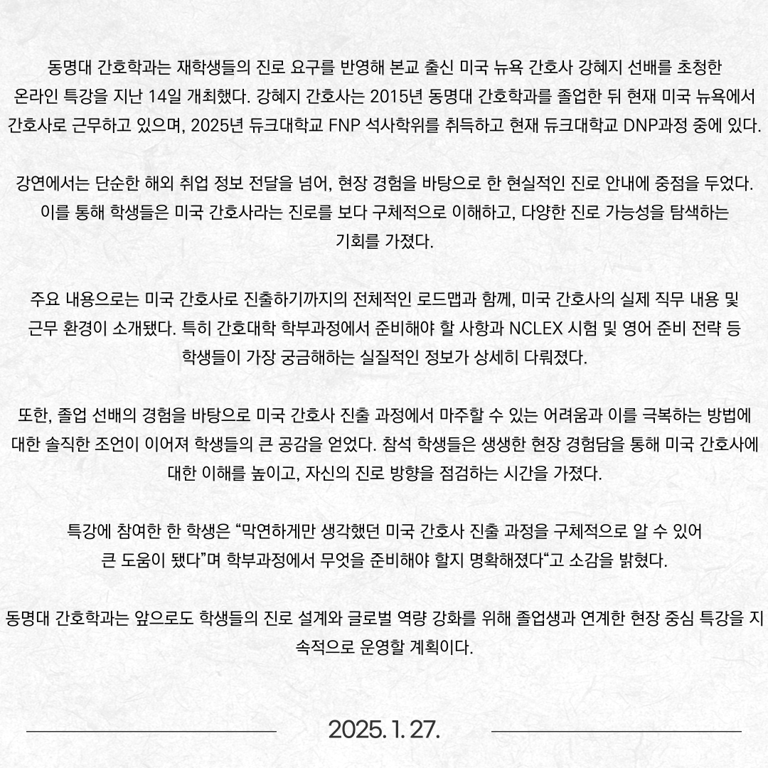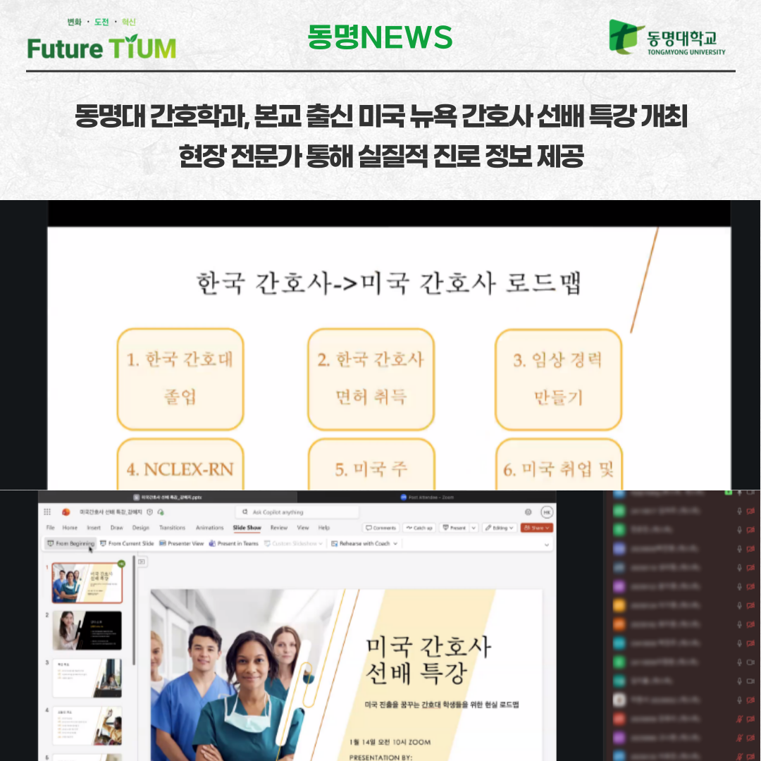 간호학과, 본교 출신 미국 뉴욕 간호사 선배 특강 개최