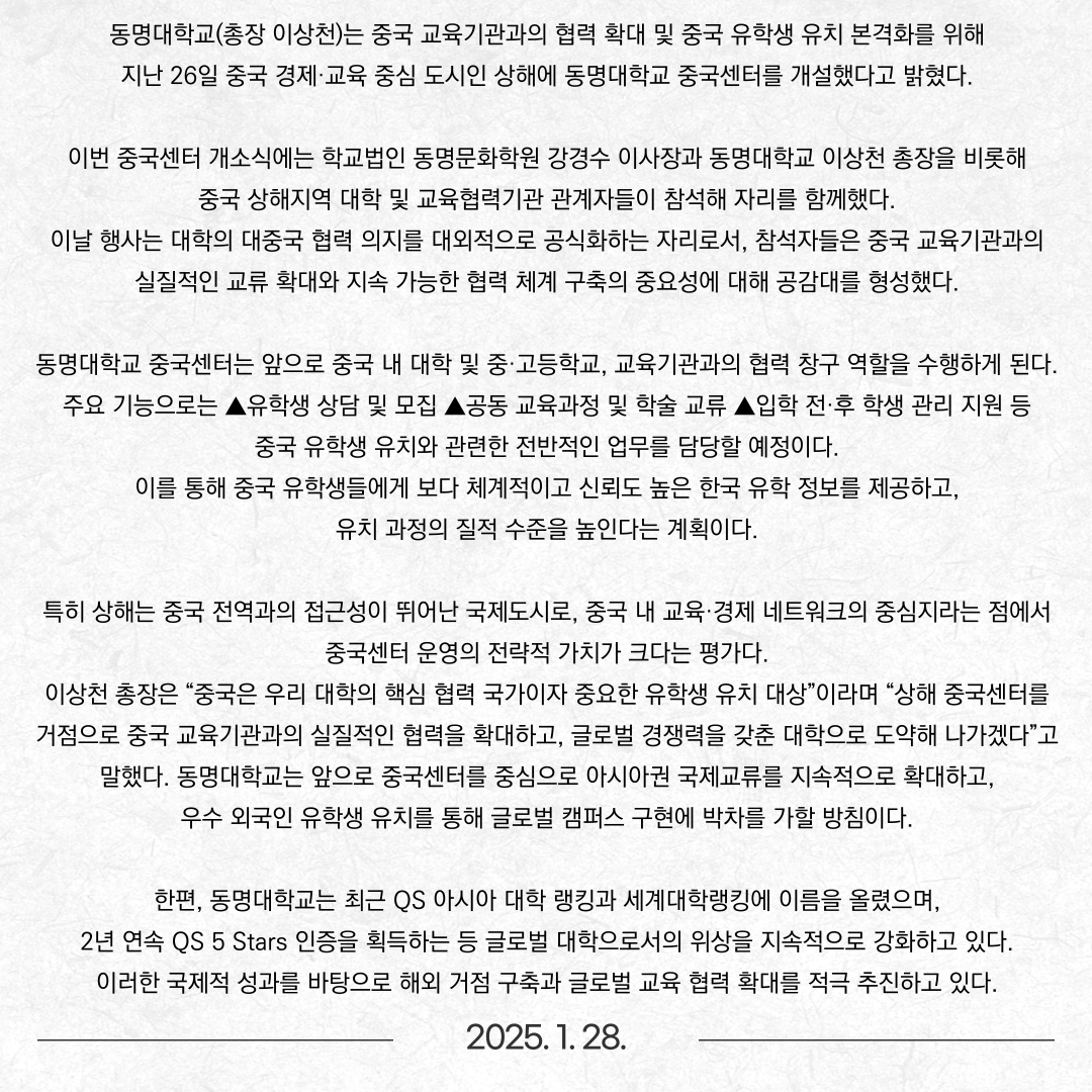 동명대학교, 상해에 중국센터 개설… 중국 유학생 유치 본격화